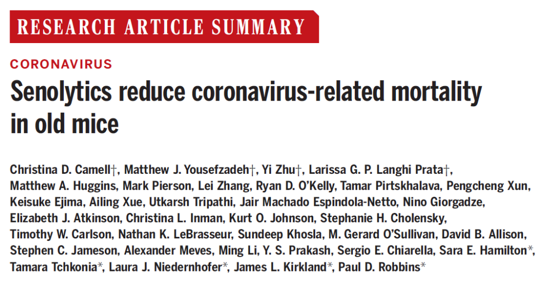 在此之前,2021年7月16日,美国明尼苏达大学和梅奥医学中心的研究团队在 Science 期刊发表了题为:Senolytics reduce coronavirus-related mortality in old mice 的研究论文【2】。这项研究表明,抗衰老药物Senolytics能够降低老年小鼠与冠状病毒相关的死亡率。