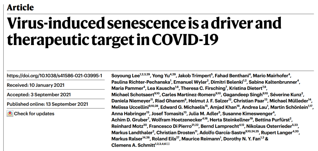 2021年9月13日,德国柏林夏里特医学院的研究人员在 Nature 上发表了题为:Virus-induced senescence is driver and therapeutic target in COVID-19 的研究论文【3】。