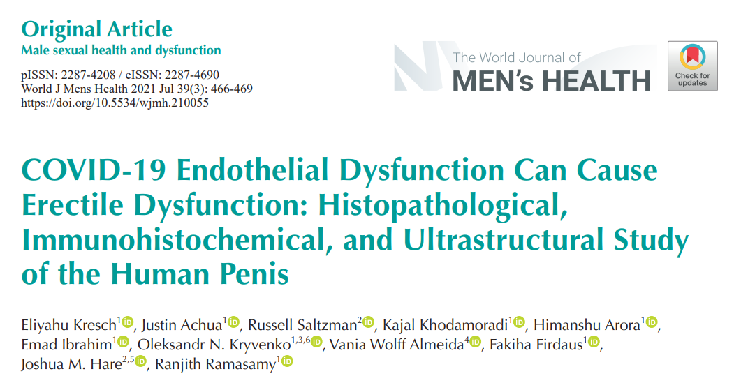 3.Kresch E, Achua J, Saltzman R, et al. COVID-19 Endothelial Dysfunction Can Cause Erectile Dysfunction: Histopathological, Immunohistochemical, and Ultrastructural Study of the Human Penis. World J Mens Health. 2021;39(3):466-469. doi:10.5534/wjmh.210055