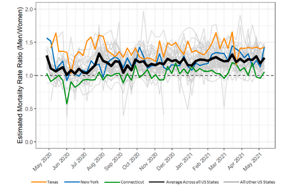 那么,COVID-19的性别差异是否真如上述研究所说的那么明显呢?Sarah Richardson 教授表示,COVID-19的性别差异在美国各州之间存在很大差异,而且在大流行过程中并不稳定。例如,在整个大流行期间,德克萨斯州男性的死亡率一直较高,而在康涅狄格州,女性的死亡率在22周内都高于男性。