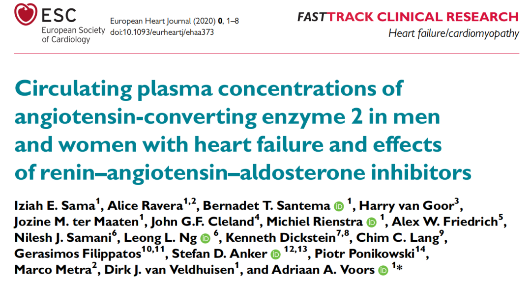2020年5月,荷兰格罗宁根大学在国际知名医学期刊 European Heart Journal 上发表题为:Circulating plasma concentrations of angiotensin-converting enzyme 2 in men and women with heart failure and effects of renin–angiotensin–aldosterone inhibitors 的研究论文【2】。