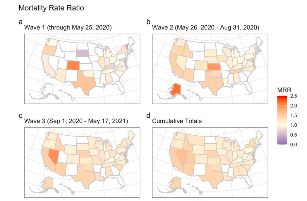 不仅如此,性别差异在各大流行病的浪潮中也有十分显著。例如,纽约累计死亡率的性别差异实际上是由大流行之初的巨大性别差异造成的。在目前正在预印的一篇相关文章中,研究团队证明,纽约州72.7%的男性额外死亡发生在2020年3月14日至5月4日的第一波大流行期间。从那时起,纽约的COVID-19性别差异已经大大缩小,接近于男女平等。