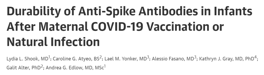 近日,美国麻省总医院 Andrea Edlow 等人在 JAMA 期刊发表了题为:Durability of Anti-Spike Antibodies in Infants After Maternal COVID-19 Vaccination or Natural Infection 的研究论文。