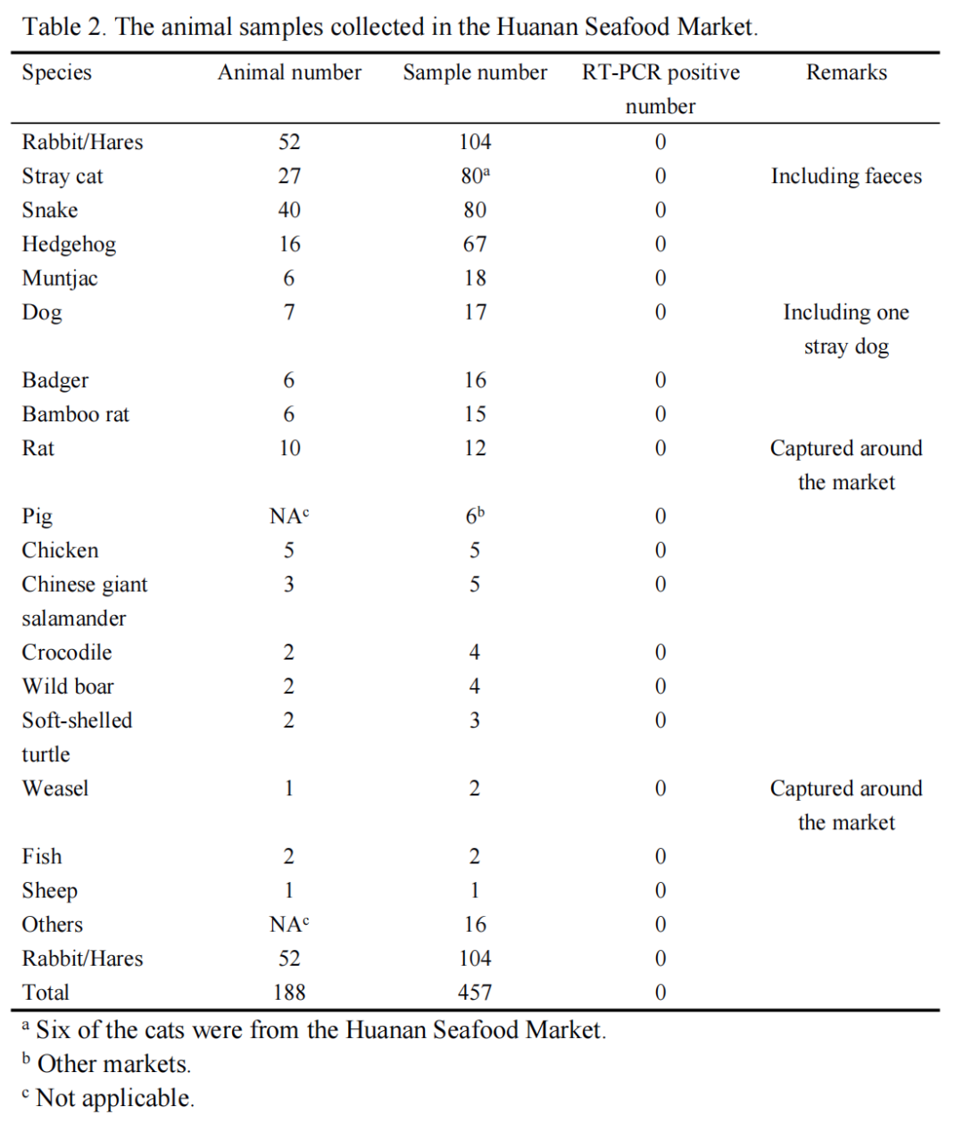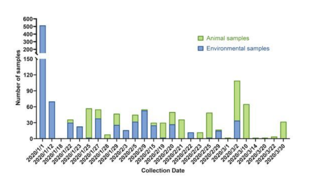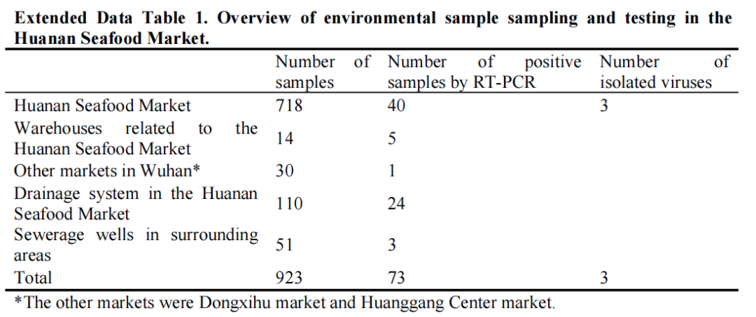 这份报告公布了2020年初从华南海鲜市场采集到的1380份样本的SARS-CoV-2检测结果:73份环境样本新冠检测阳性,大多来自市场西区,且与人群密集度呈正相关;来自18个物种的457份动物样本均为阴性。