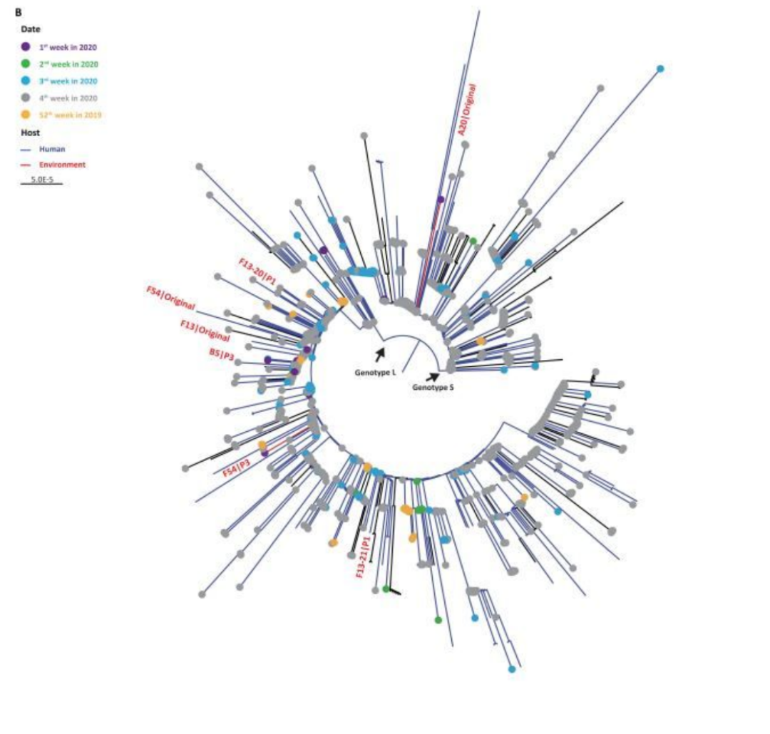 值得注意的是,此前有学者将SARS-CoV-2分为两种早期演化谱系——S(8782T; 28144C)和L(8782C; 28144T),其中S谱系更为古老。这份报告显示,从武汉华南海鲜市场环境样本中分离到的病毒株大部分属于L谱系,但环境样本A20属于S谱系。
