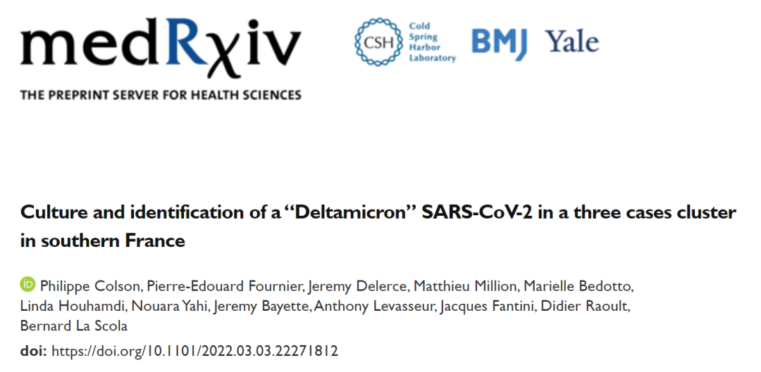 近日,法国巴斯德研究所的一个研究团队在预印本 medRxiv 发表了题为:Culture and identification of a “Deltamicron” SARS-CoV-2 in a three cases cluster in southern France 的研究论文。