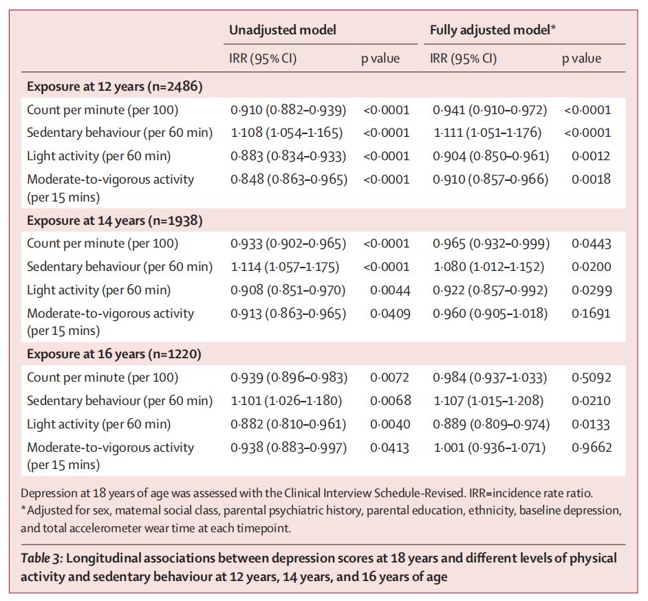总而言之,英国伦敦大学学院这项研究表明青少年时期(12-16岁)的活动量与18岁时抑郁症患病风险呈负相关关系,久坐不动在一定程度上会增加青少年患抑郁症的风险。