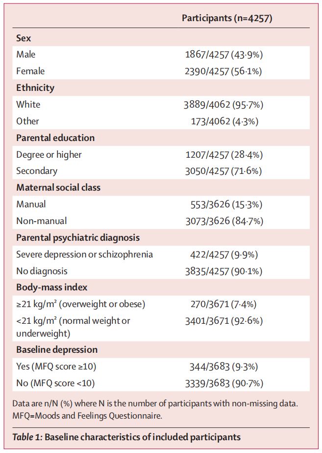 加速度计报告了这些青少年在进行活动或是久坐,活动还可分为轻度活动(如步行、演奏乐器或绘画)和体力活动(如跑步或骑自行车)。这种记录方式相较于以前的调查问卷更为客观可靠。同时,研究者还通过问卷调查的方式记录这4257名青少年是否出现抑郁症状(如情绪低落、失去乐趣和注意力不集中)及其严重程度。