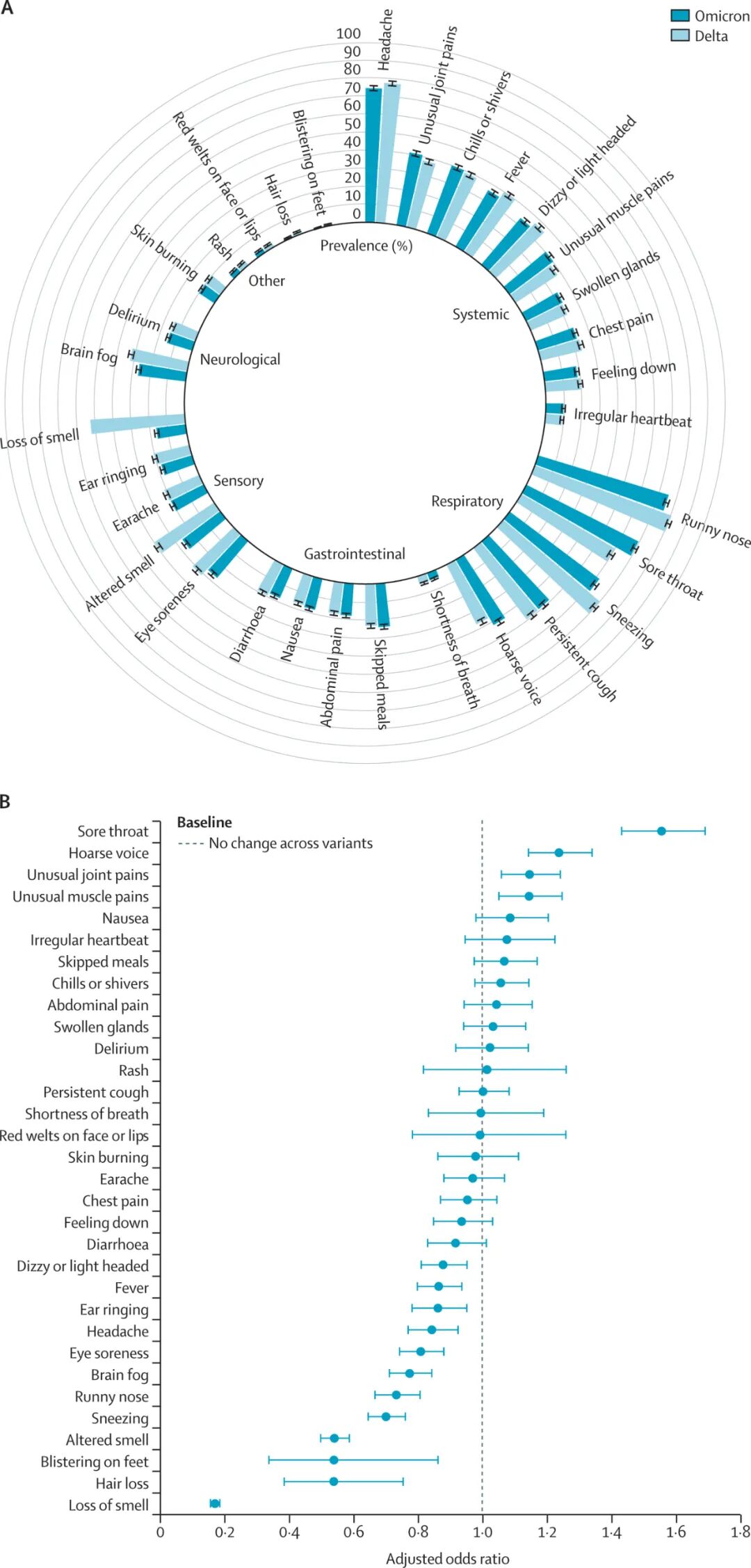 该研究调查了2021年6月至2022年1月期间接种疫苗的人感染 Omicron 和 Delta 后的症状差异。结果显示,相比 Delta,感染 Omicron 后住院的可能性降低了25%(Omicrion为1.9%,Delta为2.6%)。嗅觉丧失的风险大大降低(Omicrion为17%,Delta为53%),但喉咙痛的风险增加55%,声音嘶哑的风险增加24%。