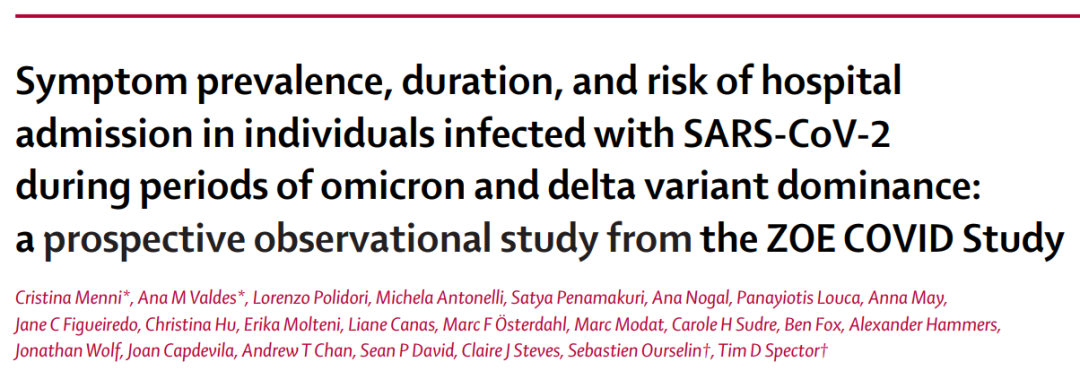 2022年4月7日,伦敦国王学院的研究人员在《柳叶刀》(The Lancet)发表了题为:Symptom prevalence, duration, and risk of hospital admission in individuals infected with SARS-CoV-2 during periods of omicron and delta variant dominance: a prospective observational study from the ZOE COVID Study 的研究论文。