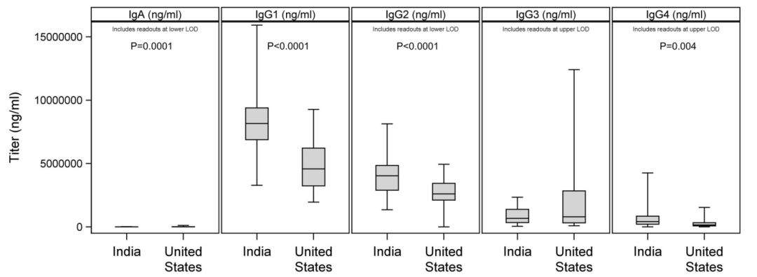 研究者发现,在斯坦福组中,B细胞亚群主要为B-1样,且血清中lgM浓度相较于新德里组更高,并且这与母亲年龄的差异无关。此外,在斯坦福组中,血清IgA水平也显著升高,而在新德里组中,IgG1、IgG2和IgG4水平显著升高,由于lgG可以跨越胎盘,因此推测是母体产生的IgGs,这也反映了印度产妇感染风险更高。