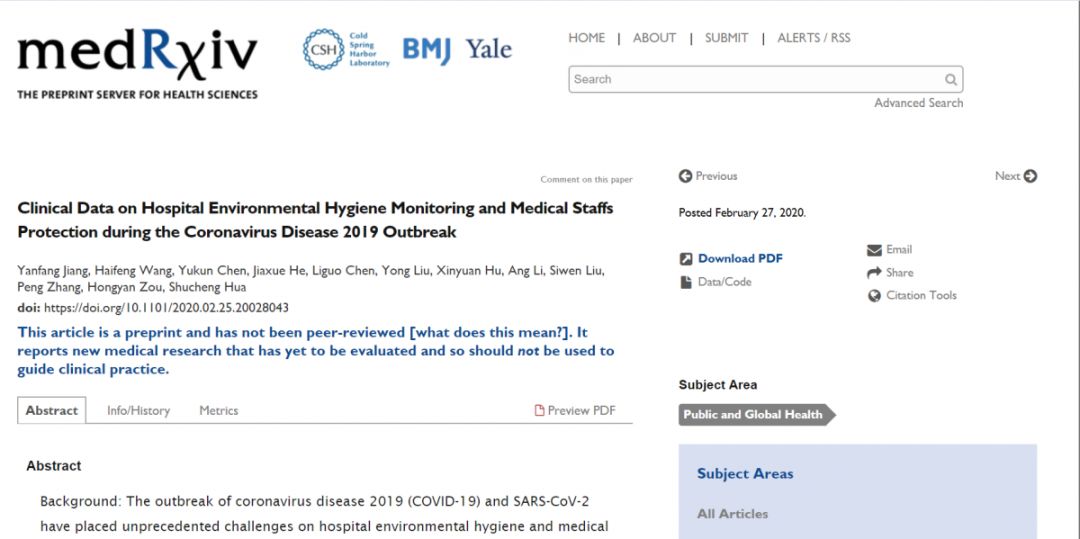 2月27日,该研究以Clinical Data on Hospital Environmental Hygiene Monitoring and Medical Staffs Protection during the Coronavirus Disease 2019 Outbreak 为题,发表在医学预印本网站 medRxiv 上。