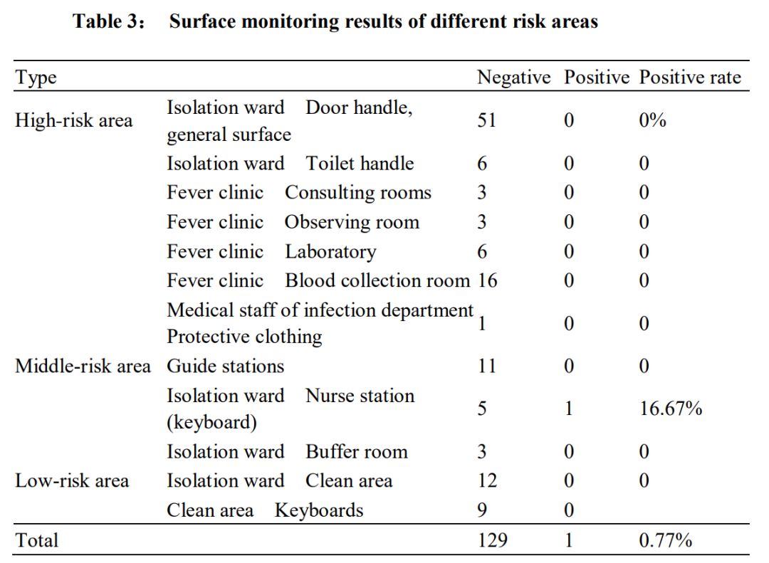 吉林大学第一医院华树成教授团队,采集了吉林大学第一医院隔离病房、发热门诊、导诊台等处空气、物表、门把手等样本,以及密切接触新冠患者的医护人员样本,使用RT-PCR法对样本中的新型冠状病毒核酸进行了检测。