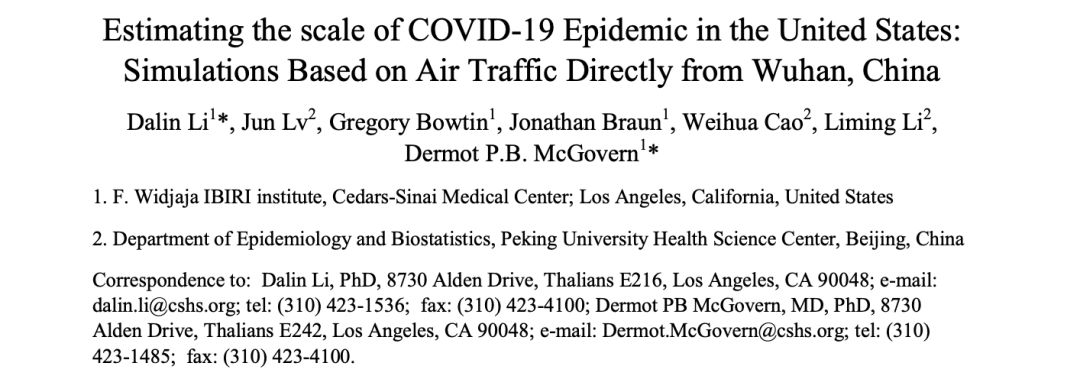 2020年3月6日,美国西达赛奈医疗中心(Cedars-Sinai) 和北京大学的研究人员合作,在预印本网站 medRxiv 发表了题为:Estimating the scale of COVID-19 Epidemic in the United States: Simulations Based on Air Traffic Directly from Wuhan, China 的研究论文。