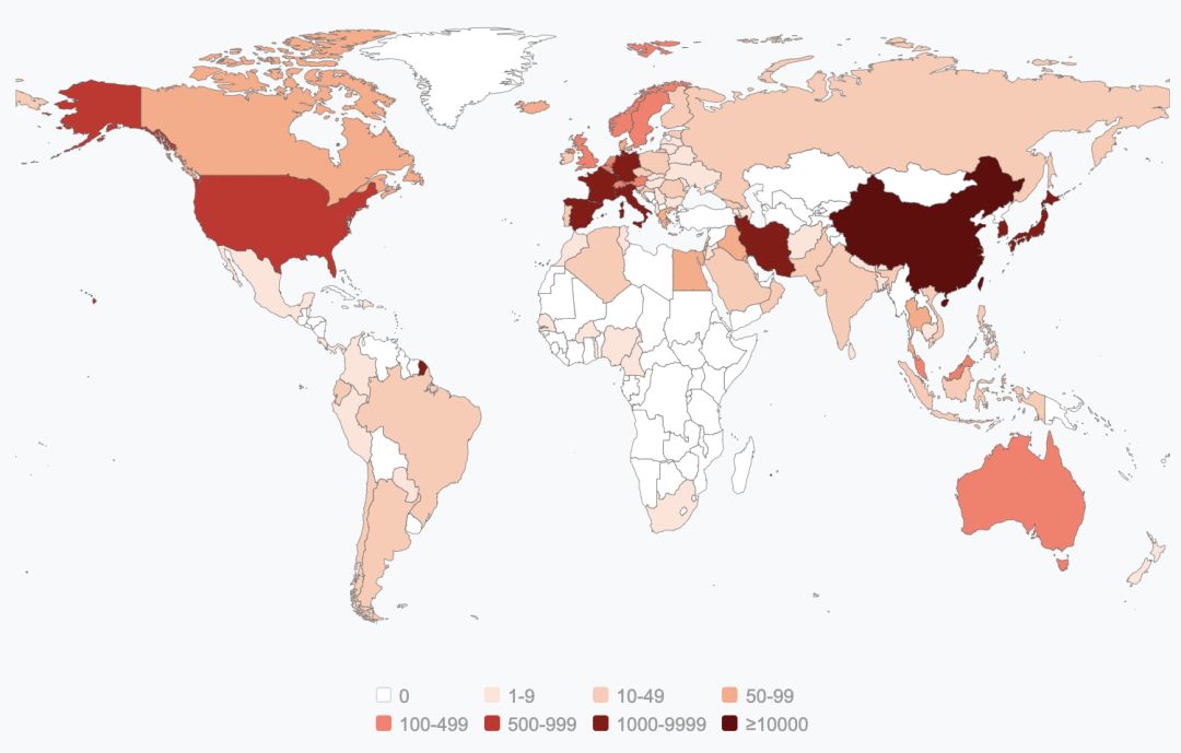 截至目前,中国境外有超过100个国家/领地/地区确诊新冠肺炎33628例,死亡889例。