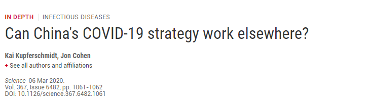对于目前新冠肺炎全球大流行的形势,2020年3月6日,国际顶尖学术期刊 Science 官网发表文章称,应建议其他国家参考中国的相应措施应对新冠肺炎的流行。