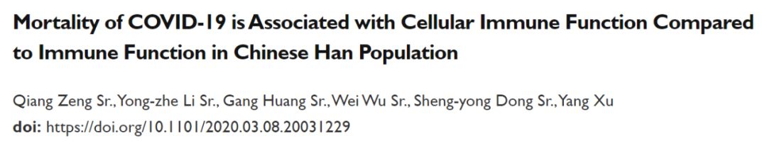 2020年3月10日,中国人民解放军总医院、北京协和医院、上海健康医学院的研究人员合作,在医学预印本网站 medRxiv 发表了题为:Mortality of COVID-19 is Associated with Cellular Immune Function Compared to Immune Function in Chinese Han Population 的研究论文。