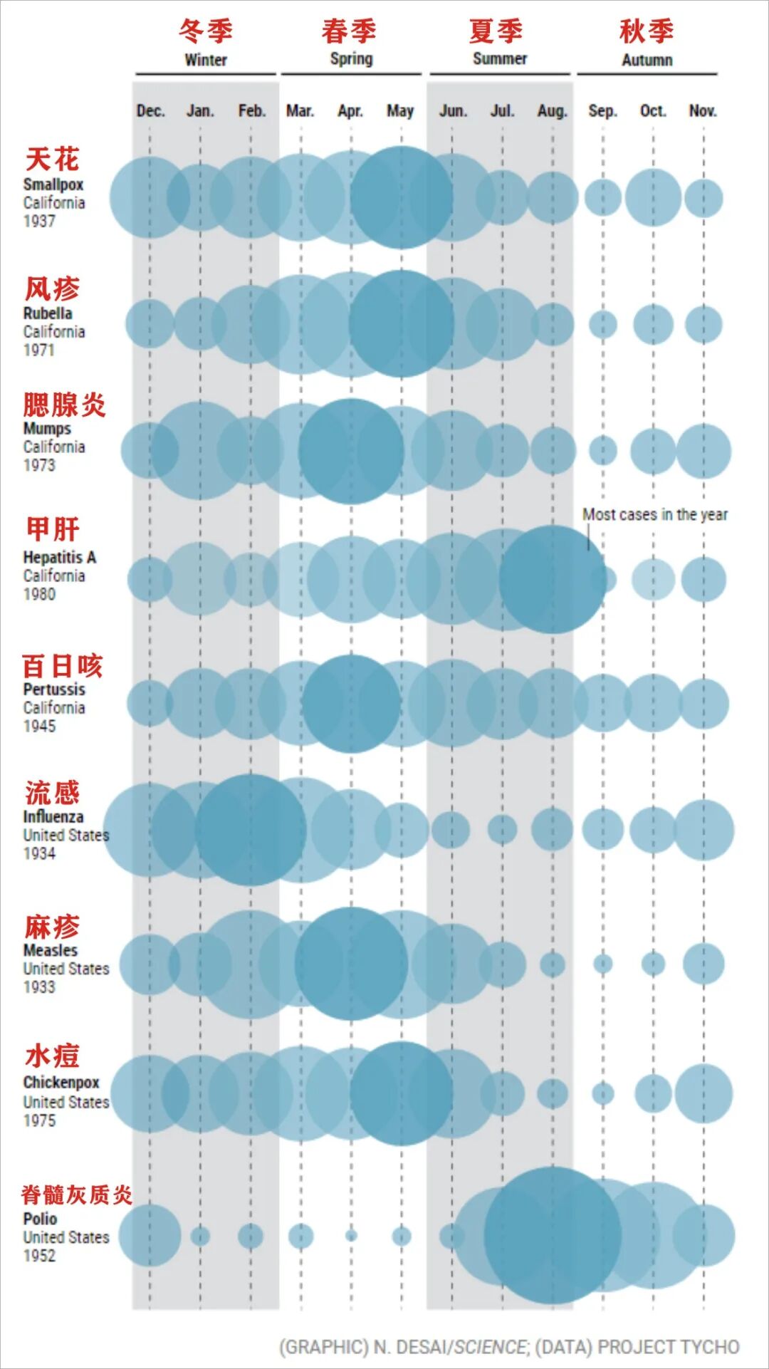2018年,美国哥伦比亚大学传染病学家Micaela Martinez在PLOS Pathogens杂志上发表的一篇论文显示:至少有68种传染病是季节性的,但它们并不同步,而且季节性也因地点而异。