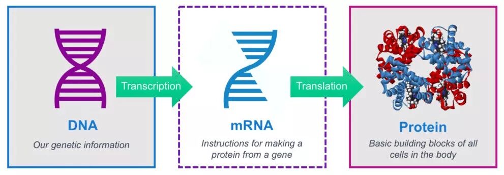 DNA转录为mRNA,mRNA翻译为蛋白质,蛋白质执行生命活动功能