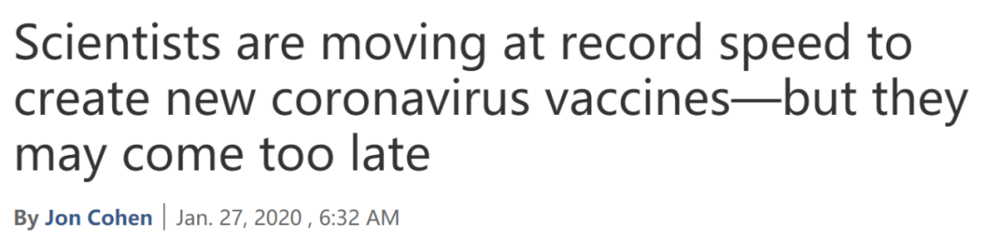 2020年1月27日,国际顶尖学术期刊《Science》杂志发表了题为:Scientists are moving at record speed to create new coronavirus vaccines—but they may come too late(科学家正以创纪录的速度开发新的冠状病毒疫苗,但可能为时已晚)。