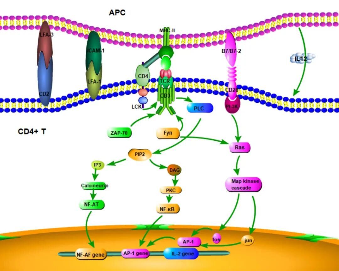 →进而活化PLC,通过DAG和IP3途径分别活化转录因子NF-kB与NF-AT