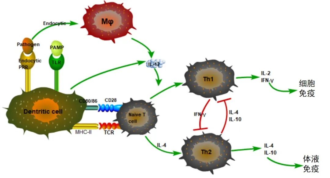 初始Th的激活:APC(DC)向初始CD4T细胞提供双信号及CK,使之活化增殖分化成效应Th细胞;→→固有免疫启动特异性免疫应答(三)