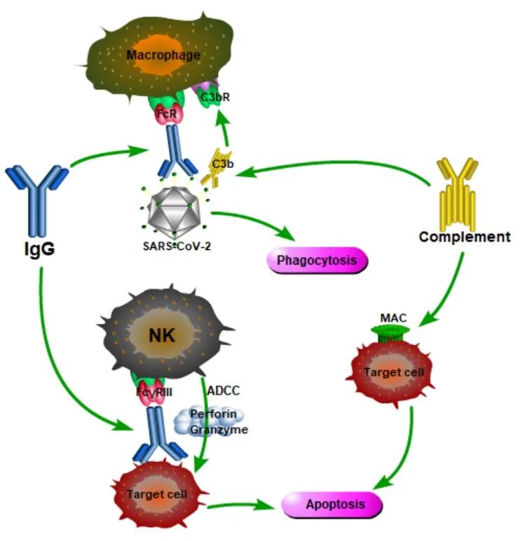 IgG与靶细胞表面相应抗原决定基特异性结合→NK细胞借助其FcyRⅢ与结合于靶细胞上的lgG的Fc段结合