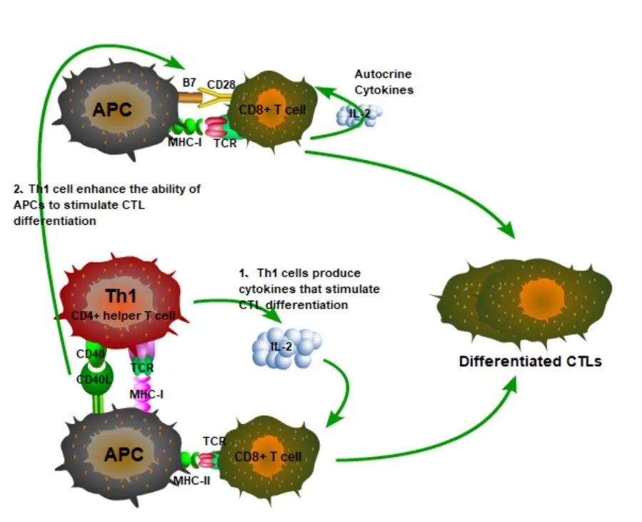 同时、CD4+ T细胞提供IL-2或刺激APC表达协同刺激分子,辅助CD8+ T细胞活化、增殖分化为细胞毒性T细胞。