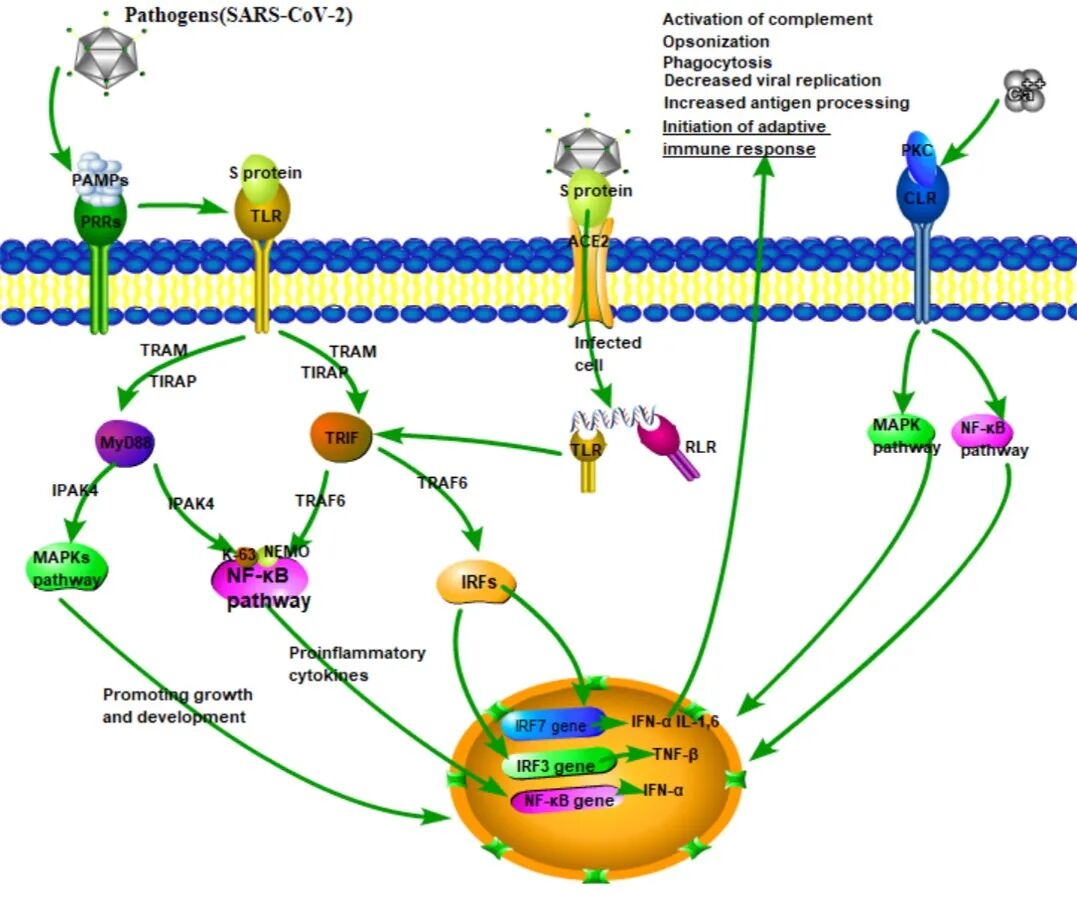 • 病毒S糖蛋白与细胞表面的ACE2受体结合,进入细胞内。TLR和RIG-I样受体(RLR)可以识别病毒的RNA,来激活TRIF分子