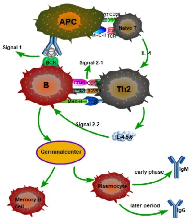共刺激信号:活化Th2细胞的CD40L与B细胞的CD40结合,向B细胞提供共刺激信号;