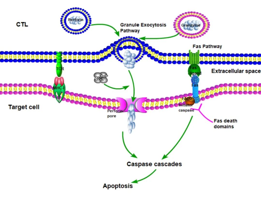 1、穿孔素/颗粒酶途径:穿孔素(perforin)→靶细胞坏死;颗粒酶(granzyme)→靶细胞周亡