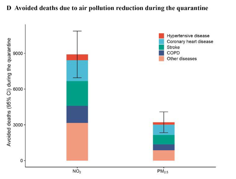 计算结果表明,隔离期间空气中二氧化氮(NO2)的降低避免了8911例死亡(95%置信区间:6950-10866),其中65%是心血管疾病和慢性阻塞性肺病;而PM2.5的降低则避免了3214 例死亡(95%置信区间:2340-4087),其中73%是心血管疾病和慢性阻塞性肺病。