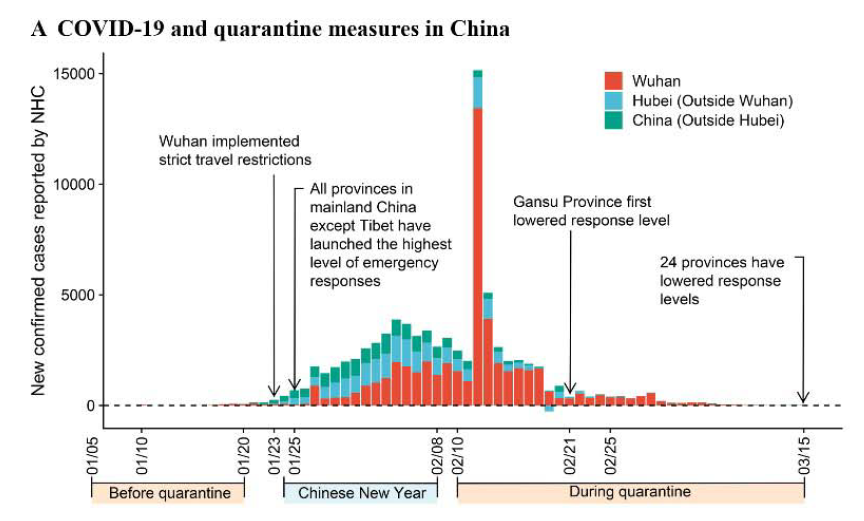 截至2020年3月14日,中国国家卫生健康委员会报告的新确诊的新冠肺炎病例下降到20例(武汉为4例),中国大多数省份也都降低了应急响应水平。因此,论文作者将“隔离期间”定义为2月10日至3月14日,将“隔离之前”定义为1月5日至20日。