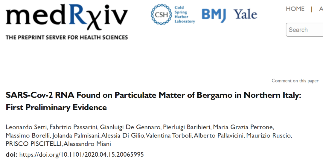 4月18日,意大利多家科研机构合作,在预印本平台medRxiv上发表了题为:SARS-Cov-2 RNA Found on Particulate Matter of Bergamo in Northern Italy: First Preliminary Evidence 的论文。