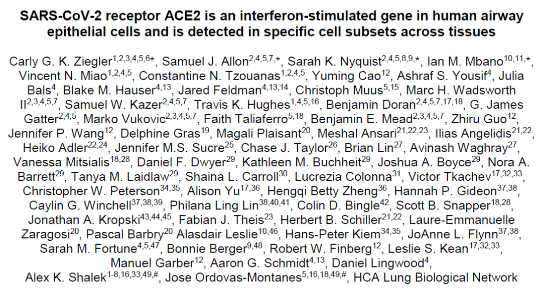 4月22日,哈佛医学院等数十家科研机构合作,在国际顶尖学术期刊 Cell 以“提前公开”形式,发表了题为:SARS-CoV-2 receptor ACE2 is an interferon-stimulated gene in human airway epithelial cells and is detected in specific cell subsets across tissues 的研究论文。