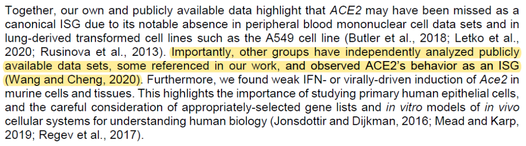 Cell 这篇论文中也明确提到了山东大学王培会团队此前的这项工作:重要的是,王培会团队分析了公开数据库,独立发现了ACE2可作为气道上皮细胞的干扰素刺激基因(ISG)。