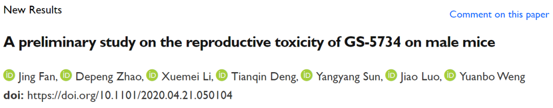 然而,屋漏偏逢连阴雨,4月23日,深圳市妇幼保健院的科研人员在预印本网站 bioRxiv上发表了一篇题为:A preliminary study on the reproductive toxicity of GS-5734 on male mice 的研究论文。