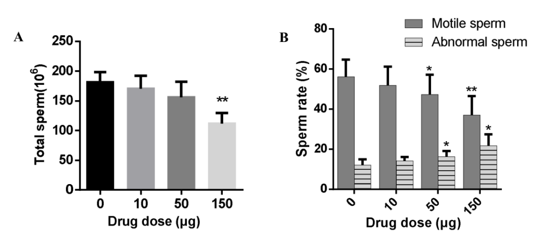 实验结果表明,瑞德西韦给药后,精子总数和运动精子率呈下降趋势,异常精子率呈上升趋势。与对照组相比,给药150ug的小鼠,精子浓度和活力显著下降,异常精子率显著增加。给药50ug的小鼠精子活力也显著下降,异常精子率增加。