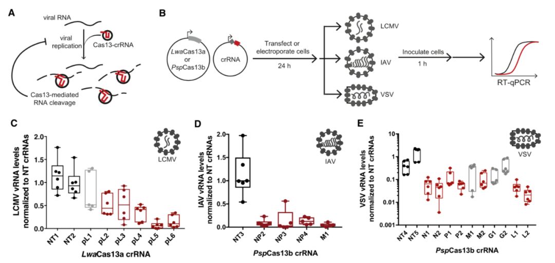 研究人员通过实验测试了Cas13在分别感染了三种不同RNA病毒的人类细胞中的活性:淋巴细胞性脉络丛脑膜炎病毒(LCMV)、甲型流感病毒(IAV)和疱疹性口炎病毒(VSV)。研究人员将Cas13基因片段和一种工程化的引导RNA导入细胞,24小时后,将细胞暴露在病毒中。再过24小时后,Cas13酶使细胞培养中的病毒RNA水平降低了多达40倍。