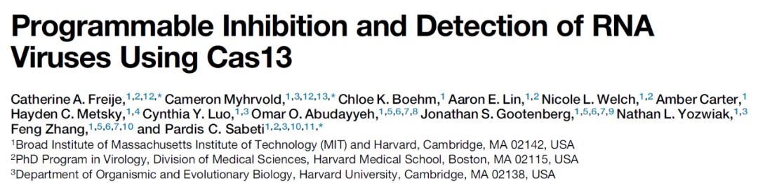 2019年10月10日,Broad研究所Pardis Sabeti、张锋等人在Cell 子刊 Molecular Cell 杂志发表了题为:Programmable Inhibition and Detection of RNA Viruses Using Cas13 的研究论文。