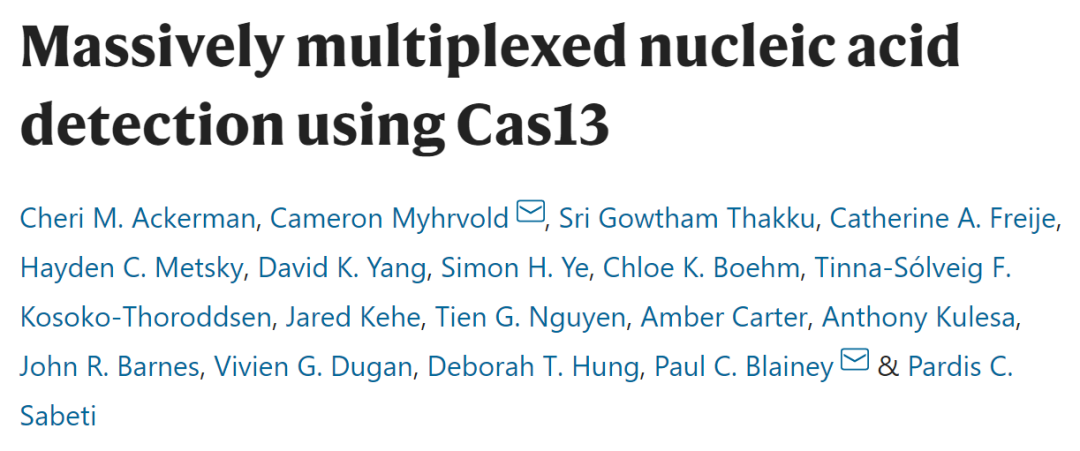 2020年4月29日,有“埃博拉斗士”之称的 Parson Sabeti 在Nature 发表了题为:Massively multiplexed nucleic acid detection using Cas13(使用Cas13的大规模多重核酸检测)的研究论文。