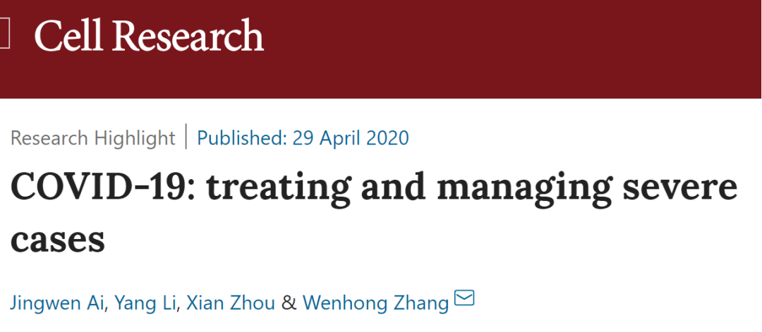 4月29日,张文宏在 Cell Research 期刊发表题为:COVID-19: treating and managing severe cases 的亮点文章。