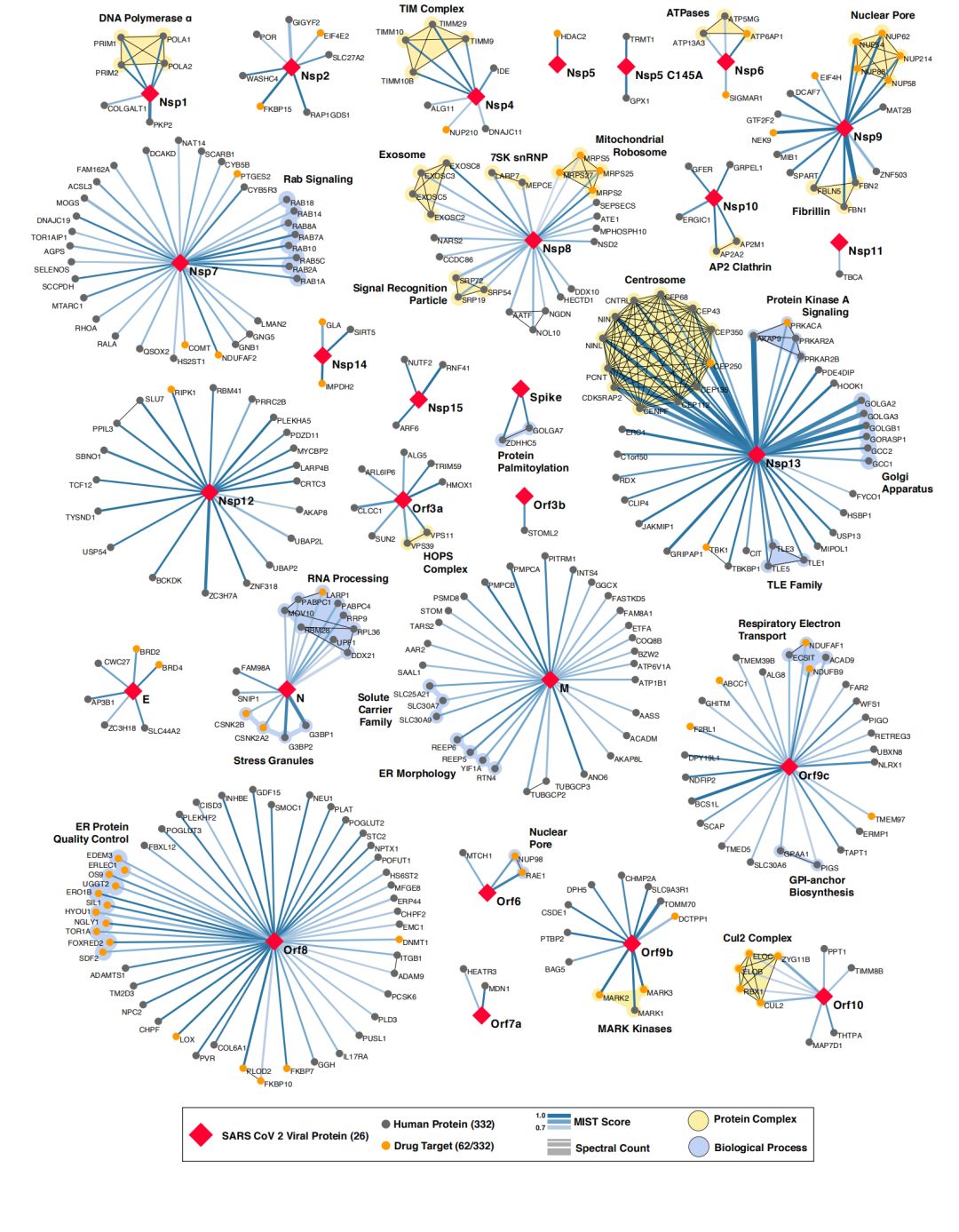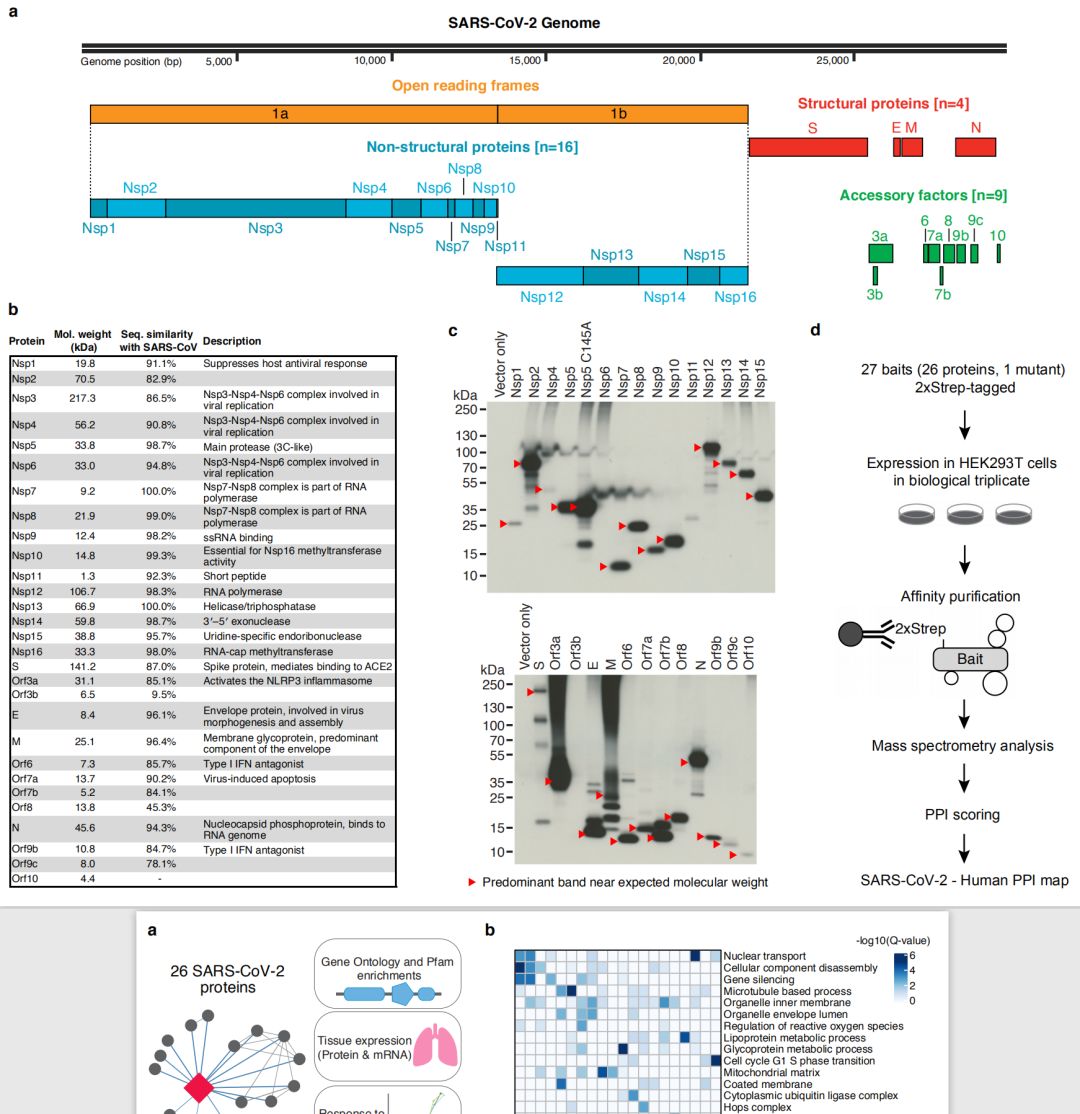 研究人员在人类细胞中克隆表达了29种SARS-CoV-2病毒蛋白中的26种,并通过亲和纯化-质谱法(AP-MS)鉴定了与每一种病毒蛋白物理相关的人类蛋白,共确定了332种高度可信的SARS-CoV-2与人的蛋白-蛋白相互作用(PPIs)。