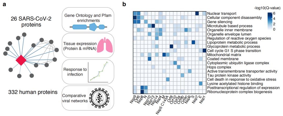 对于每种SARS-CoV-2病毒蛋白,研究人员进行了基因本体论富集分析,并发现SARS-CoV-2病毒蛋白在人体中连接到广泛的细胞生物学过程,包括: