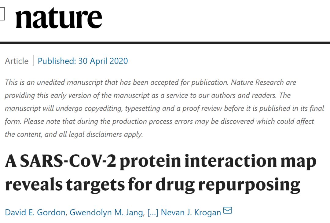 4月30日,加州大学旧金山分校定量生物科学研究所(QBI)的研究人员在 Nature 在线发表题为:A SARS-CoV-2 protein interaction map reveals targets for drug repurposing 的研究论文。该研究已于3月22日在预印本bioRxiv上线.。