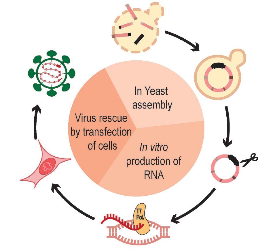 但是,例如冠状病毒这种大型RNA病毒,由于基因组大小的问题,很难在大肠杆菌中进行克隆和操纵,因此需要另一种快速而强大的反向遗传学平台进行研究。