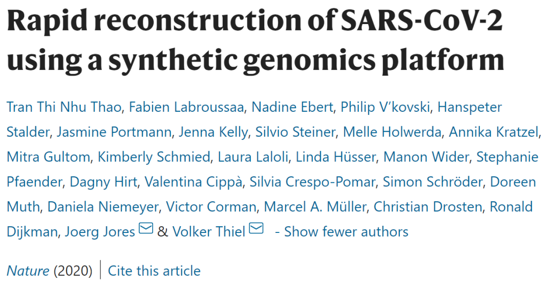 5月4日,瑞士伯尔尼大学的Jorerg Jores和Volker Thiel团队在 Nature 发表了题为:Rapid reconstruction of SARS-CoV-2 using a synthetic genomics platform 的研究论文。