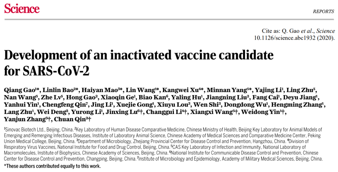 2020年5月6日,中国医学科学院医学实验动物研究所秦川团队等多个团队合作,在国际顶尖学术期刊 Science 杂志上发表了题为:Rapid development of an inactivated vaccine candidate for SARS-CoV-2 的研究论文,该研究曾于2020年4月20日提前发布在预印本 bioRxiv 上。