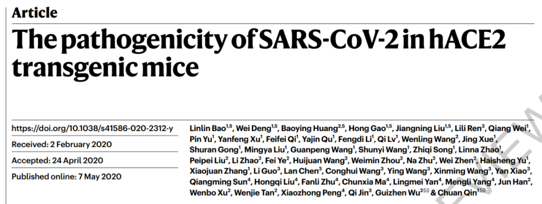 一天之后的5月7日,中国医学科学院医学实验动物研究所秦川团队在国际顶尖学术期刊 Nature 杂志发表题为:The pathogenicity of SARS-CoV-2 in hACE2transgenic mice 的研究论文,该研究曾于2020年2月28日提前发布在预印本 bioRxiv 上。