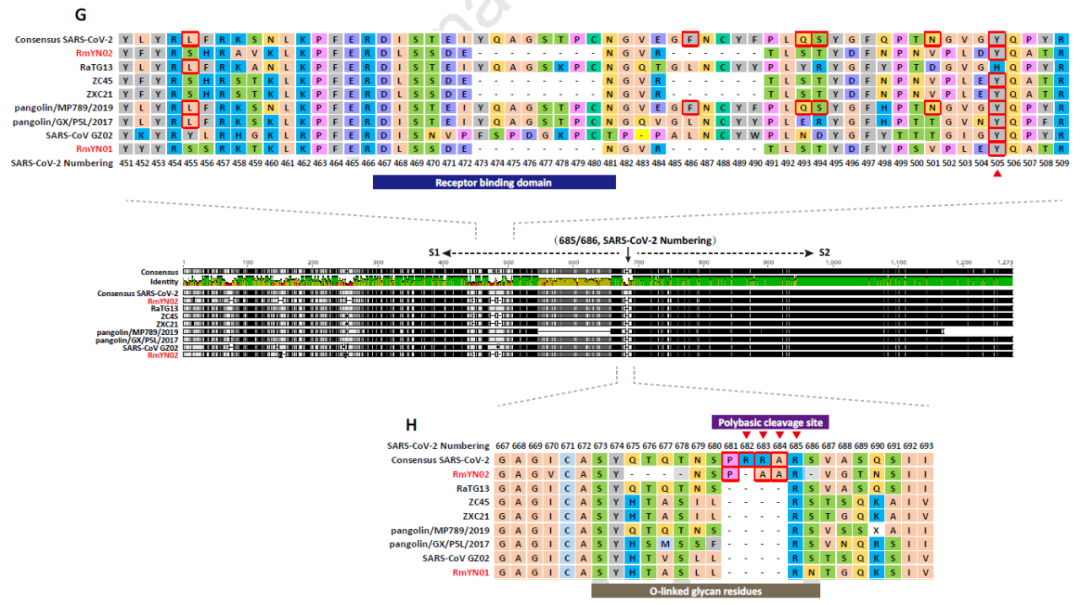 新冠病毒(SARS-CoV-2)的一个显著特征是在S1和S2的连接处插入了4个氨基酸。这种插入是新冠病毒所特有的,迄今为止在所有的新型冠状病毒序列中都存在。尽管RmYN02插入的氨基酸与新型冠状病毒不同,但这表明类似的氨基酸插入事件是可以独立发生的。